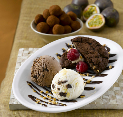 Perfect for chocolate lovers, a scoop of Limited Edition Mascarpone, Passion Fruit & Truffles and a scoop of Choc Choc Chip ice cream, partnered with a freshly baked chocolate pecan cookie, whipped cream, fresh raspberries, a sprinkling of crocanti and a generous helping of chocolate fudge sauce, guarantees an immense chocolate fix.