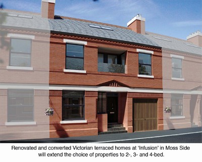 Infusion is a development by Manchester City Council in partnership with Miller Homes and G.B. Building Solutions and funded by the Homes and Communities Agency. It offers 71 eco-rated homes including 7 new build homes and 64 renovated and converted properties. The renovated homes are being radically redeveloped, with innovative floor plans and designs. All the homes are being built or converted to very high standard of eco-friendliness, with solar panels, water butts, thermal “skin” insulation and sun pipes being used. The new build homes are built to Sustainable Homes Code Level 4. The result will offer a choice of 2-, 3- and 4-bed homes with low running costs.