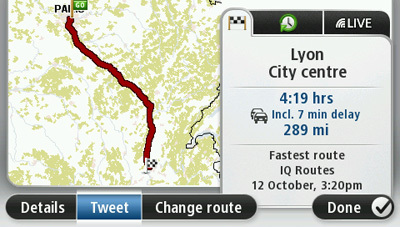 The Twitter functionality in the TomTom GO LIVE 1005 WORLD features an option to tweet your destination to your followers with the estimated time of arrival. The Twitter message is pre-set by the driver before they set off, so they can concentrate safely on the road without worrying about informing people when they're going to arrive. The estimated time will be updated before arrival to give more accuracy. All Twitter functionalities are optional - they can be turned on and off, depending on the user's preferences.